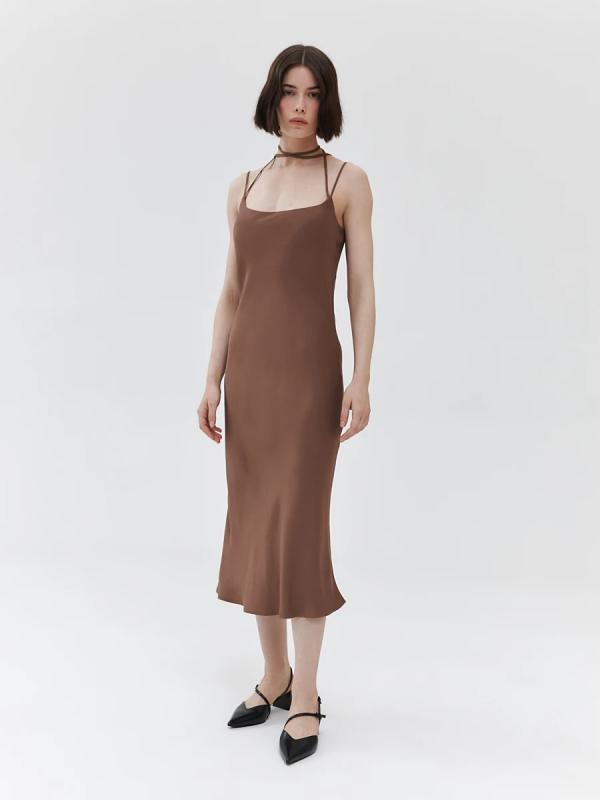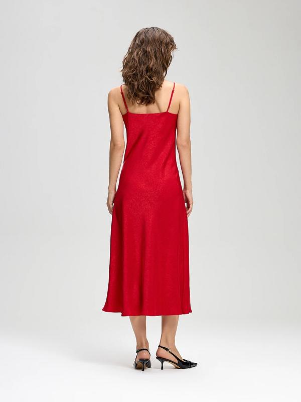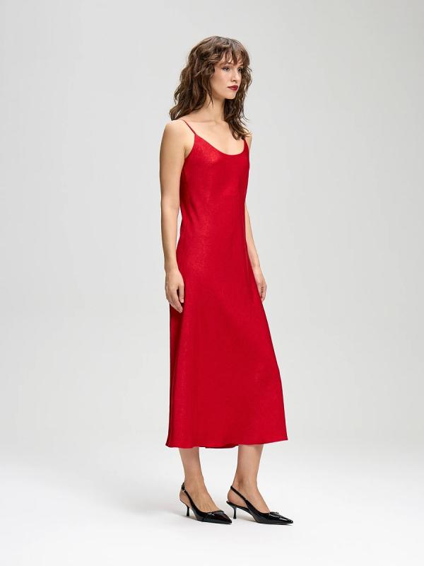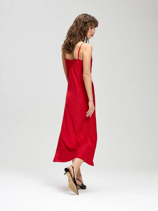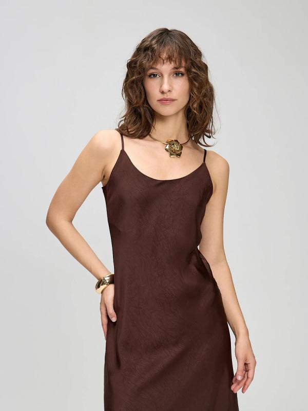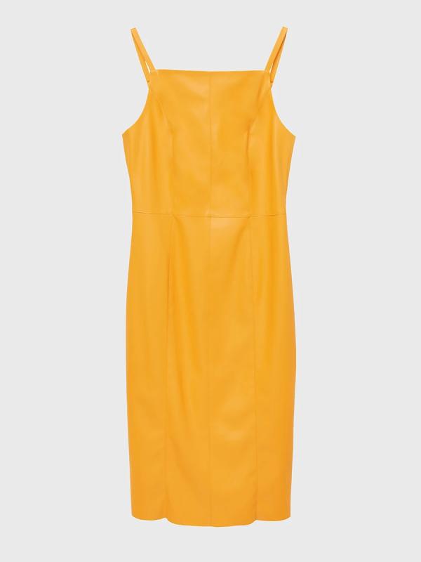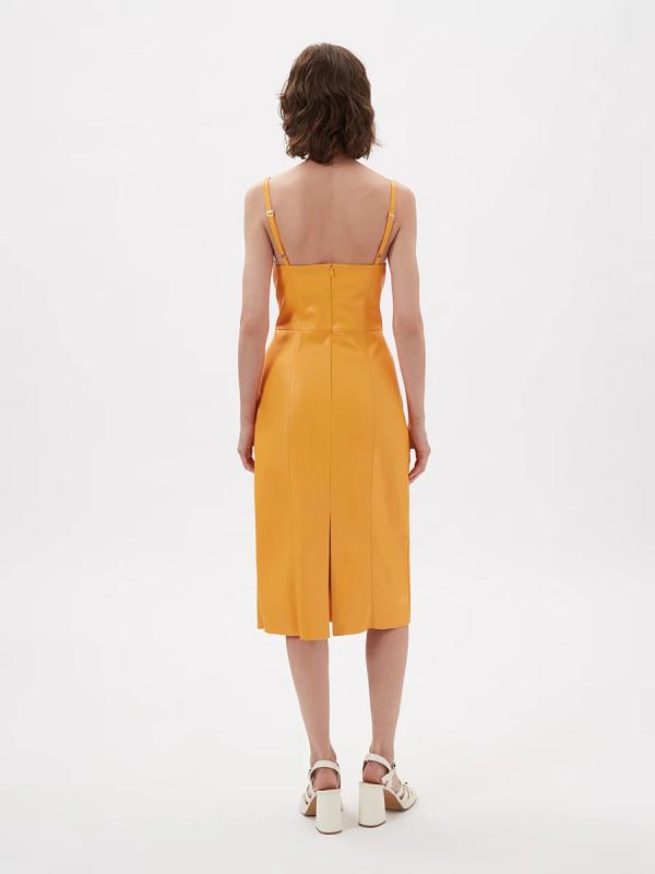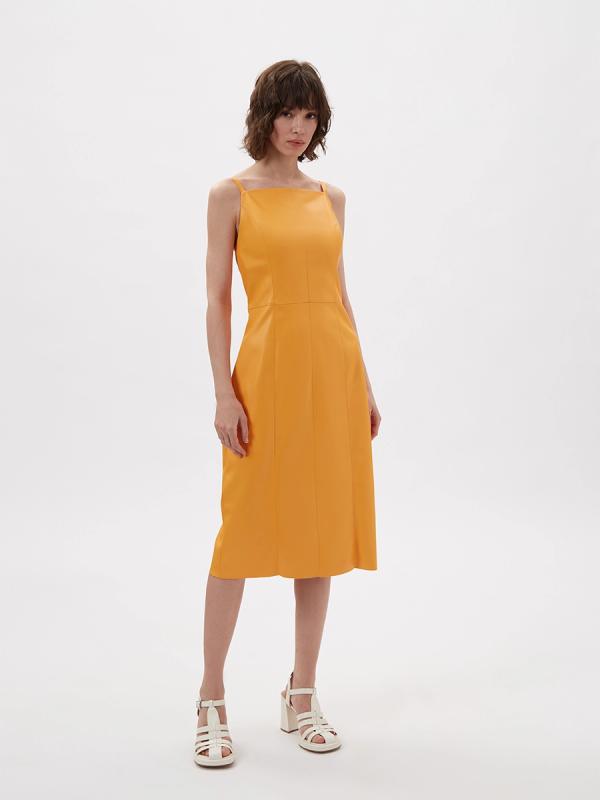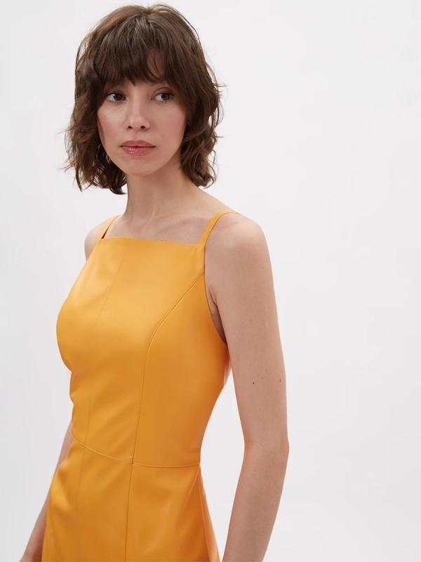 Сарафан из экокожи оранжевого цвета.• прилегающий силуэт • длина ниже колена• регулируемые бретели• каре-образная горловина• шлица