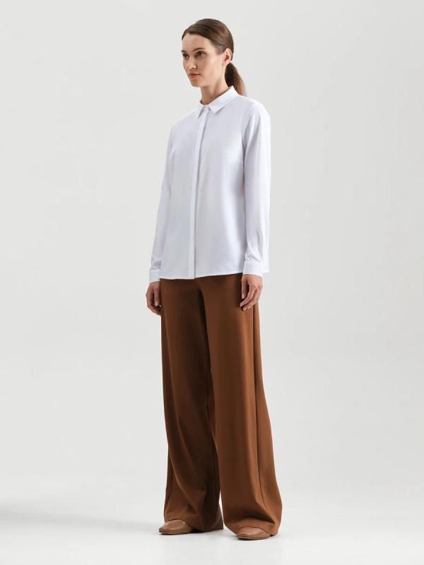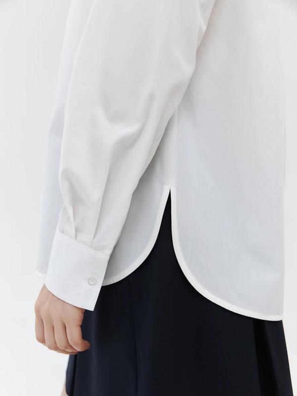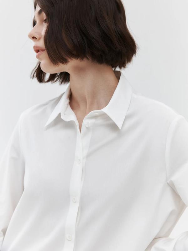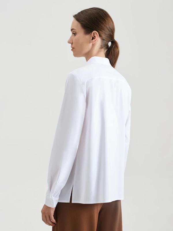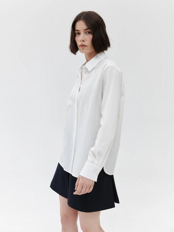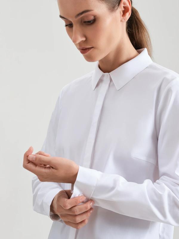 Классическая белая рубашка - незаменимый базовый элемент женского гардероба. Данная модель прямого свободного кроя выполнена из плотной высококачественной ткани, приятно ложится к телу и не просвечивает. Застегивается на ряд потайных пуговиц, что делает дизайн более минималистичным. В боковых швах по низу проходят аккуратные разрезы - ненавязчивая акцентная деталь для варианта носки навыпуск. - свободный крой - длинные рукава - отложной воротник - потайной ряд пуговиц - разрезы по бокам