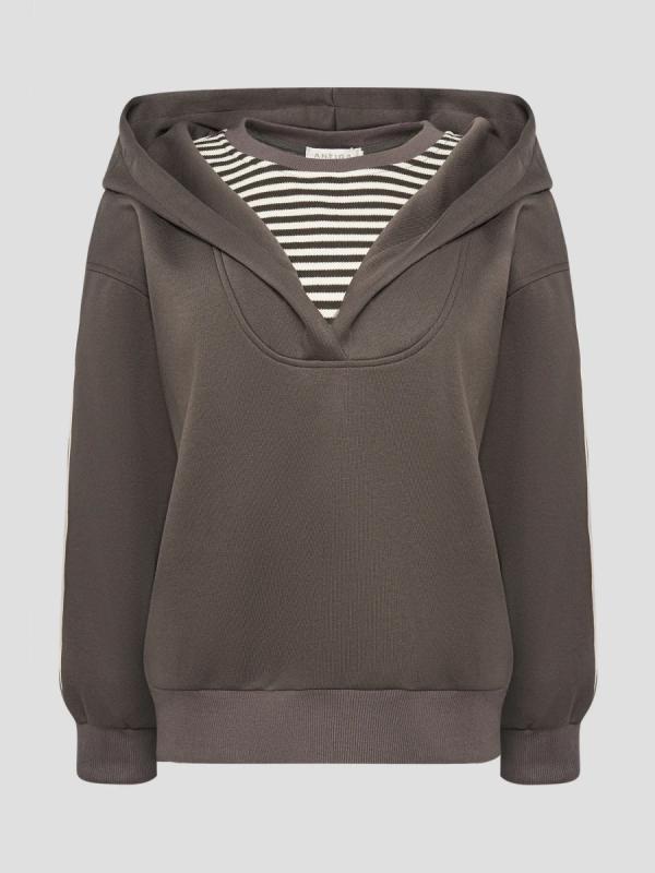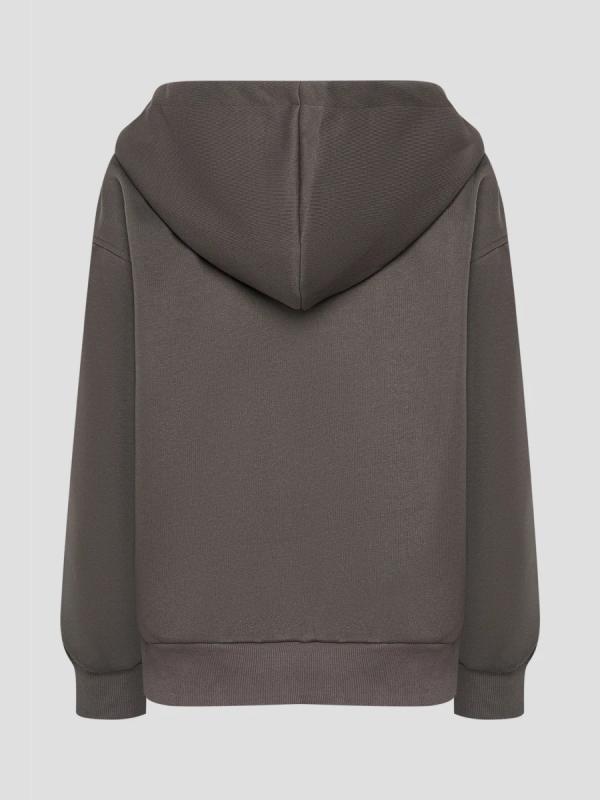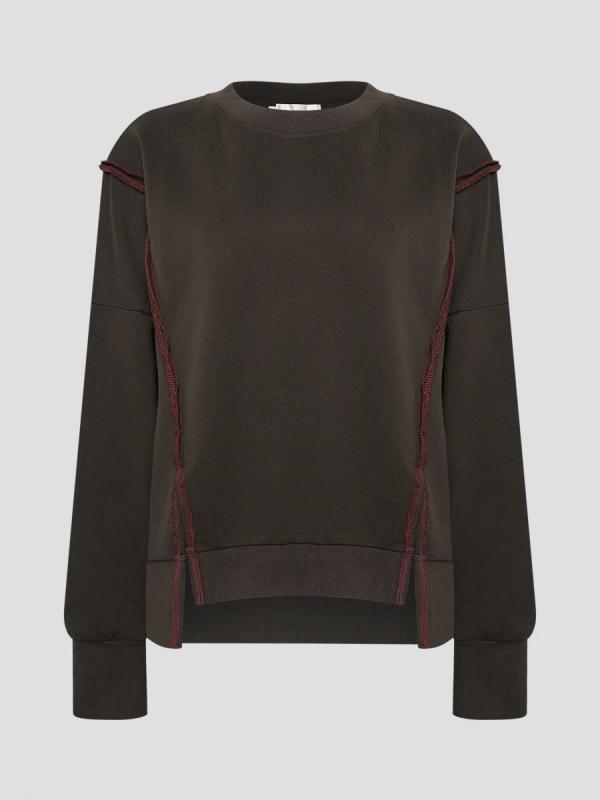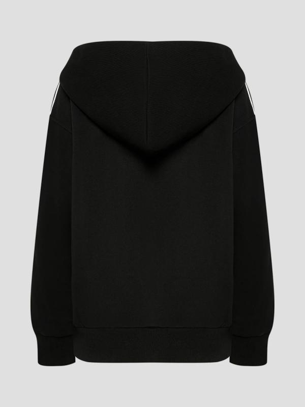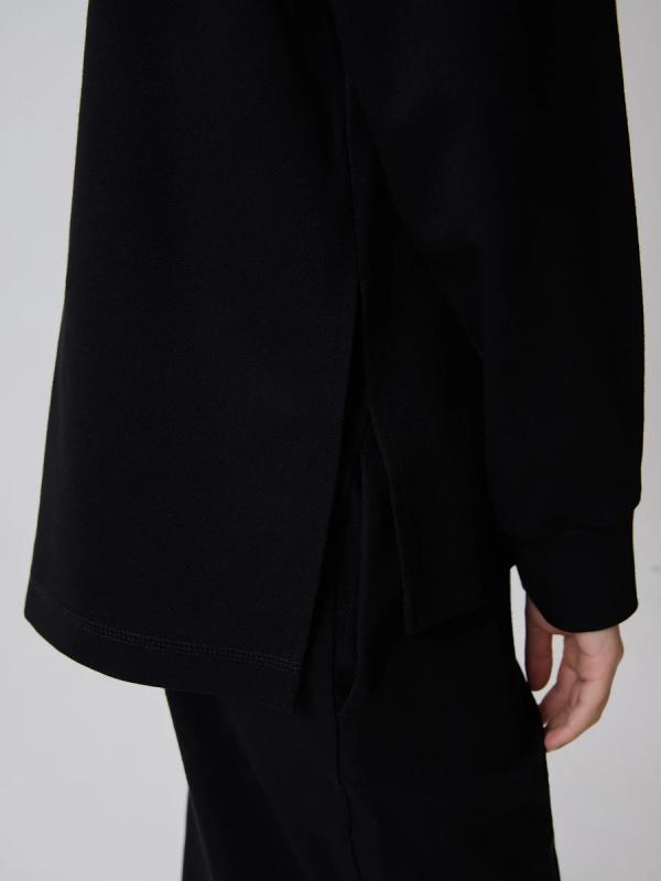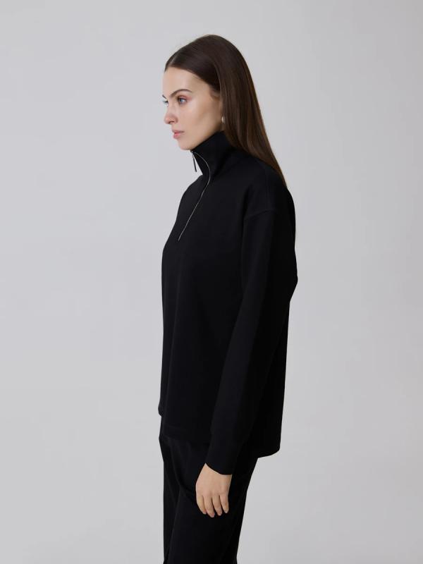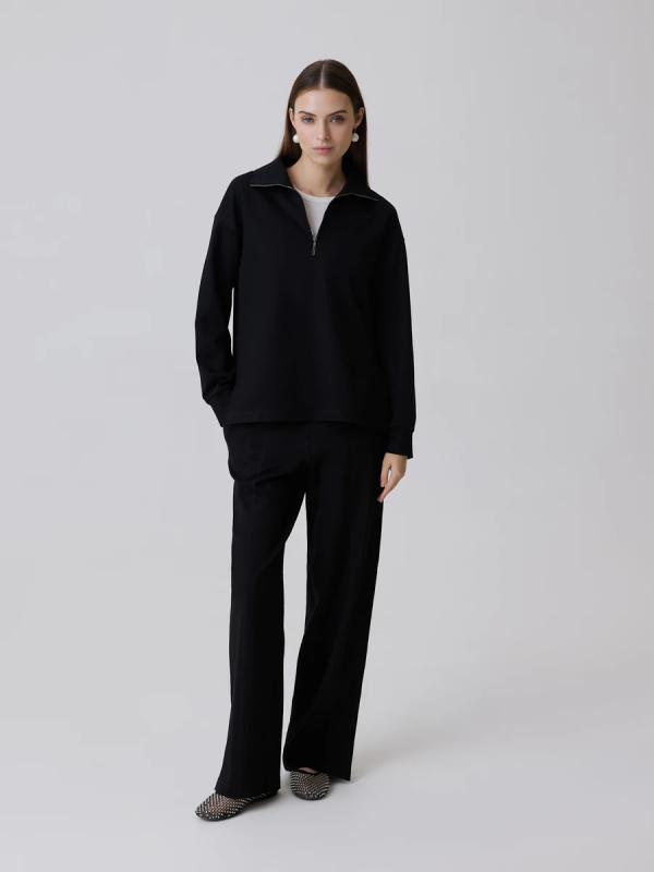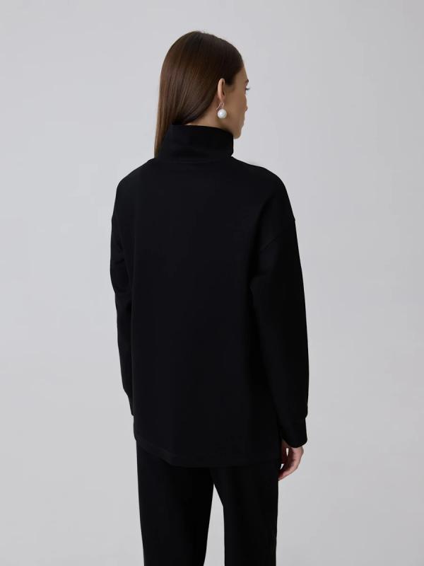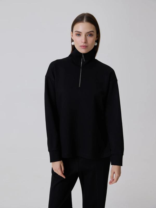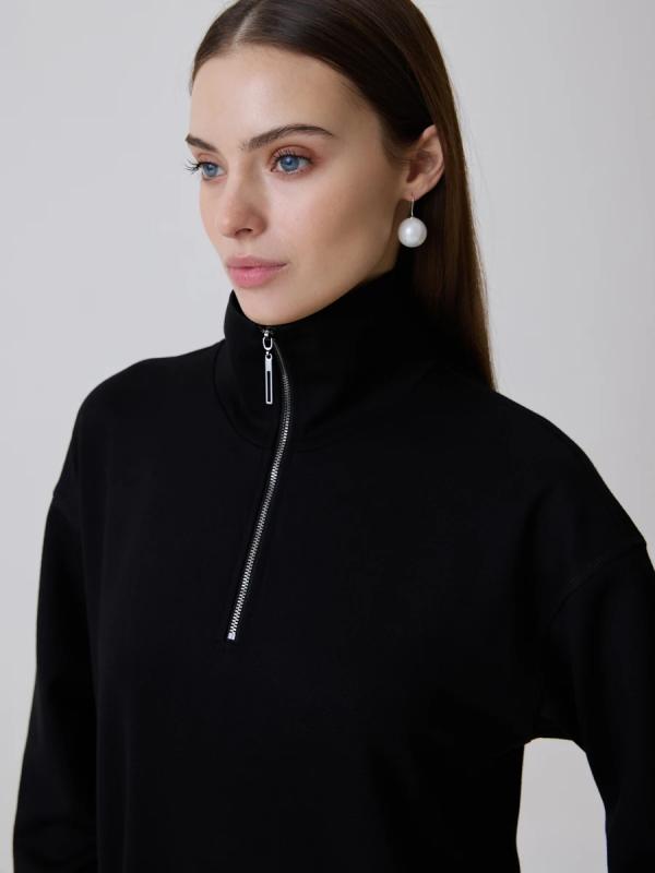 Oversize свитшот на молнии в универсальном черном цвете. Модель выполнена из мягкого высококачественного трикотажа с прорезиненными вставками на рукавах. Асимметричный низ оснащен аккуратными разрезами в боковых швах. Серебристая молния позволяет регулировать разрез и в застегнутом виде образует высокий воротник. Свитшот идеально подойдет для стильных повседневных образов в сочетании со свободными джинсами или спортивными брюками. - свободный крой - длинные рукава - разрезы - асимметричный низ - молния