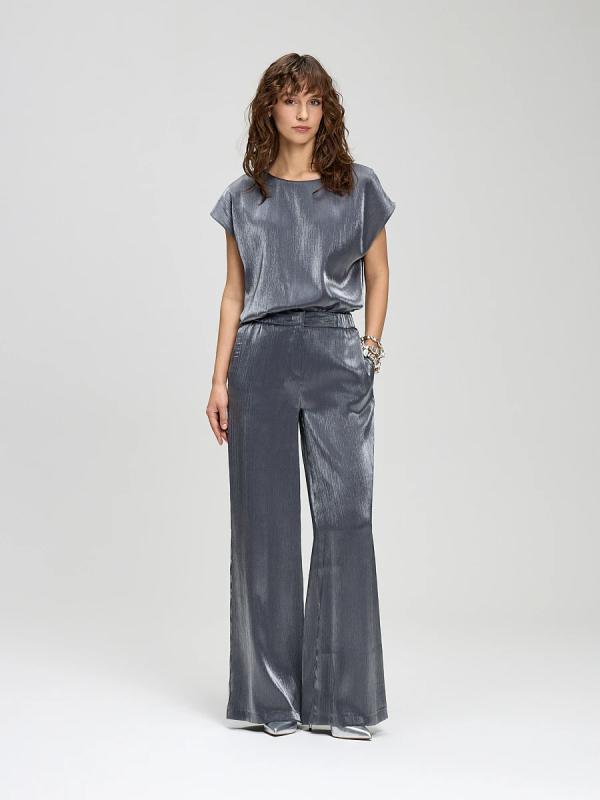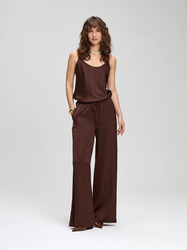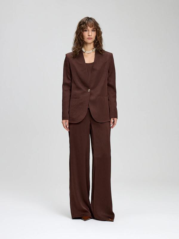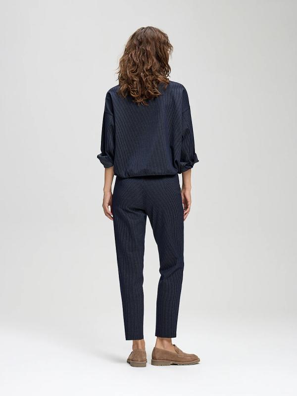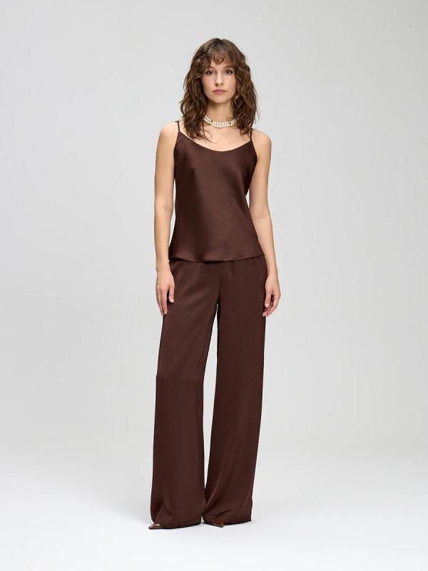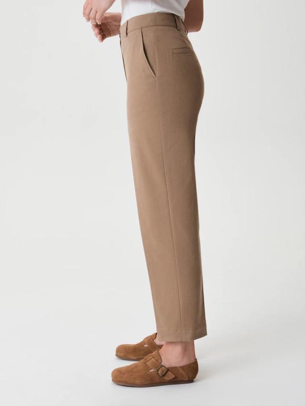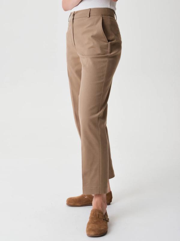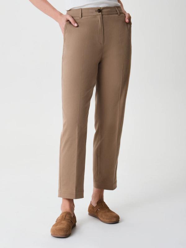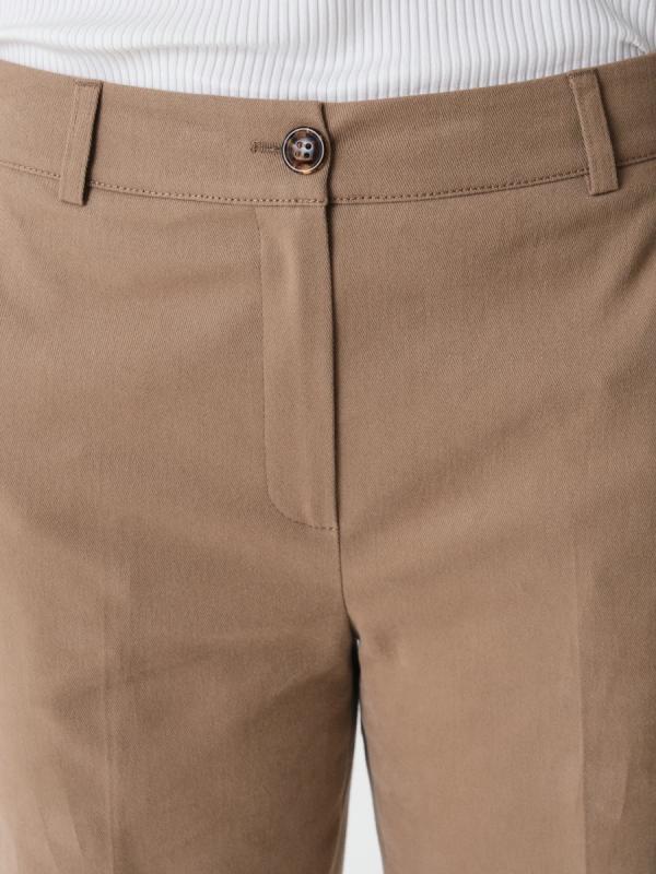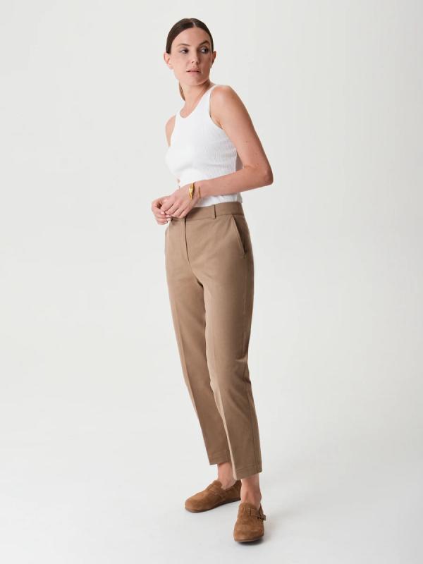Укороченные классические брюки трендового песочного оттенка из плотной ткани. Благодаря особенностям кроя модель идеально сядет на любой тип фигуры. Средняя анатомическая посадка обеспечивает комфортную носку, а шлевки по периметру пояса позволяют дополнить образ ремнем. Длина 7-8 открывает линию щиколоток. По всей длине проходят заутюженные вертикальные стрелки. Спереди имеются вместительные функциональные карманы, а задние карманы оформлены декоративной строчкой. - высокая посадка - длина 7-8- стрелки - карманы - шлевки для ремня - пуговица и потайная молния - зауженный крой